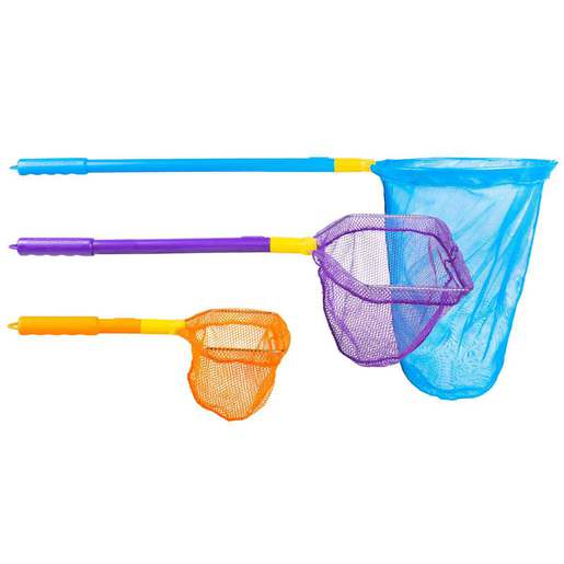 Ranger Assorted Kids Nets - Package includes a Floating Butterfly net, Floating Creature and Bait net and a Floating Bait and Shell net. Floating Butterfly net has a 24" handle with a 12" hoop. Floating Creature and Bait net has a 18" handle with a 11" x 9" hoop. Floating Bait and Shell net has a 10" handle with a 8" x 8" hoop. FloatingLightweightGreat for kids