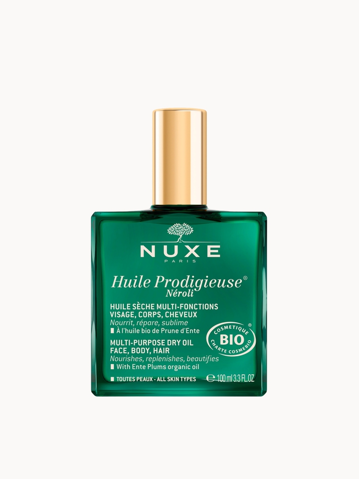 Add a luxurious hero-product to your collection, with the NUXE Huile Prodigieuse® Néroli Multi-Purpose Dry Oil. The fast-absorbing formula is ideal for use on the hair, face and body, offering a lightweight boost of hydration where it is most needed.An airy texture avoids any heavy residue being left, while organic ente plum oil deeply nourishes. Organic sesame oil encourages a weightlessly dry finish, while a host of antioxidants protects from external aggressors.
