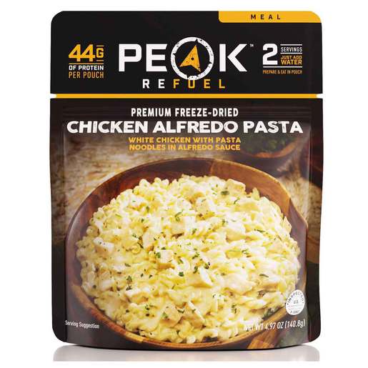 Peak Refuel Chicken Alfredo Pasta - 2 Servings - After a long day of following your compass, settle down with some Italian-style pesto sauce mixed with ziti noodles, real white chicken, spices, and parmesan cheese. Now how does Peak Fuel do that? By only using premium, freeze-dried, all natural ingredients that keep their shape, taste, and nutritional value. Giving you 43 grams of protein, 15 percent of your daily iron, and 35 percent of your daily calcium, just add 2/3 cups of water and restore your energy and get ready for the next stage of your adventure. Protein – 43g per pouch Servings - 2 Serving size – ½ pouch Contains – Milk, Wheat Net Weight – 5.71oz Made & Packaged in the USA Calories per Pouch - 920 Prep Time - 10 min HIGH PROTEIN | 100 percent REAL MEAT | PREMIUM INGREDIENTS - Chicken Pesto Pasta: White Chicken With Ziti Noodles in Creamy Pesto Sauce