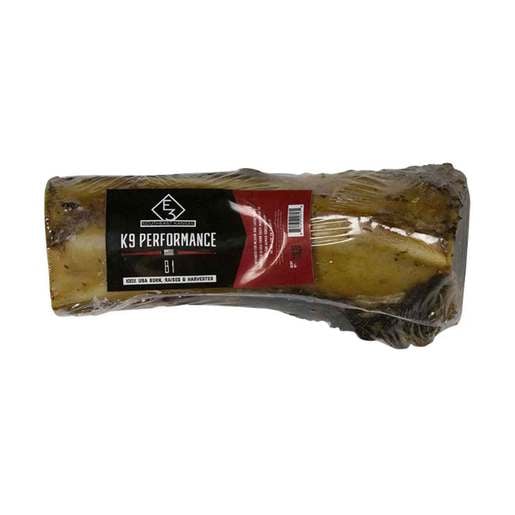 E3 K9 Performance B1 7in Hind Shank Bone - At the E3 Ranch in America’s heartland, E3's respect for God’s creation drives us to fully utilize the cattle they raise, leaving nothing to waste. E3 designate every element – meat, bone, and hide – for re-purpose. Feeding Instructions: As part of a healthy diet, feed E3 K9 Performance treats as a snack, treat, or reward for positive behavior. E3 recommend 1 treat per 5lbs of dog's body weight daily. Always monitor your pet while treating. B1 Bones 100% All Natural Whole Beef Shin Bones (7in long, approx. weight 1lb each) No Antibiotics or Hormones Ever Intended for Medium and Large Dogs B1 Bone Guaranteed Analysis: Crude Protein > 30%, Crude Fat > 15%, Moisture < 6%