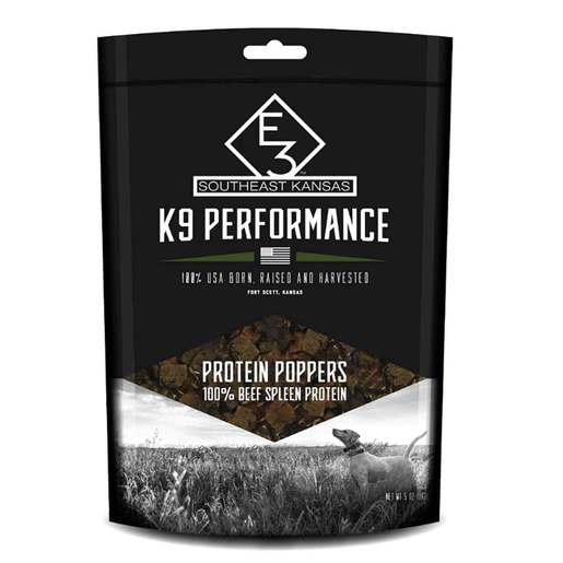 E3 K9 Performance Protein Poppers Dog Treats - At the E3 Ranch in America’s heartland, E3's respect for God’s creation drives them to fully utilize the cattle they raise, leaving nothing to waste. E3 designate every element – meat, bone, and hide – for re-purpose. Feeding Instructions: As part of a healthy diet, feed E3 K9 Performance treats as a snack, treat, or reward for positive behavior. We recommend 1 treat per 5lbs of dog's body weight daily. Always monitor your pet while treating. Made From 100% USA Beef Spleen Born, Raised, and Harvested in the USA 100% All-Natural High Quality Ingredients that will Not Cause Inflammation High Protein, Low Fat Nutrient Rich with Collagen, Glucosamine, and Chondroitin for Healthy Joints Intended for Dogs of All Sizes Guaranteed Analysis: Crude Protein > 60%, Crude Fat > 20%, Crude Fiber < .25%, Moisture < 8%