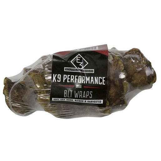 E3 K9 Performance BLT Wraps Dog Treats - At the E3 Ranch in America's heartland, E3 respect for God's creation drives them to fully utilize the cattle they raise, leaving nothing to waste. E3 designate every element – meat, bone, and hide – for re-purpose. Feeding Instructions: As part of a healthy diet, feed E3 K9 Performance treats as a snack, treat, or reward for positive behavior. Always monitor your pet while treating. 100% Beef Lung and Trachea Born, Raised, and Harvested in the USA 100% All-Natural High Quality Ingredients that will Not Cause Inflammation No Antibiotics or Hormones Ever All Natural 100% Beef, No Preservatives, No Additives Intended for Dogs of All Sizes Guaranteed Analysis: Crude Protein > 35%, Crude Fat > 40%, Crude Fiber < .25%, Moisture < 10%