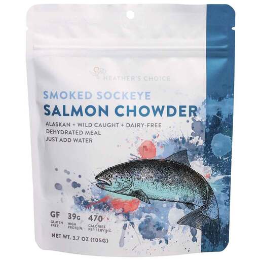Heather's Choice Smoke Sockeye Salmon Chowder Dinner | Adventuring Meal - Smoked Sockeye Salmon Chowder There’s a reason the Smoked Sockeye Salmon Chowder is our favorite backpacking meal! Our salmon is wild-caught in the Cook Inlet of Alaska and hot smoked just down the road in Ninilchik. We mix a hefty portion of salmon with carrots, celery, and potatoes in our chowder, and lightly season it with dill, cayenne and white pepper. Coconut milk powder makes this meal creamy and calorie rich! Finally, an Alaskan backcountry chowder that everyone can enjoy! The Heather’s Choice Smoked Sockeye Salmon Chowder provides an allergen-safe backpacking food option for individuals with a variety of dietary restrictions; being free of gluten, soy, eggs, dairy, and peanuts. Our dehydrated backpacking foods contain no artificial flavors, MSG, fillers, or preservatives. Enjoy an ultralight backcountry meal made with all real ingredients, no surprises. With a total packed weight of just 4 oz per serving, this meal is a perfect lightweight backpacking food option for individuals looking to curb hiker hunger with healthy calories. Our Smoked Sockeye Salmon Chowder is made with wild-caught, never farmed, sustainably sourced salmon high in heart-healthy omega-3s. Our just add water meals are a convenient solution both on and off the trail! Heather's Choice products are ready for your next hiking, backpacking, backcountry hunting, fishing, or boating adventure. Our lightweight, packable meals are easy to stow on any outdoor recreational adventure and require just boiling water to prepare. Enjoy the same ready to eat convenience at home or in the office! Product Highlights Vegan and gluten-free No artificial flavors, MSG, fillers, or preservatives All real ingredients, no surprises Rich in healthy fat for long-lasting energy Free of gluten, soy, eggs, peanuts, and dairy Nutrition Facts Serving Size: 1 Pouch (113g). Servings Per Container: 1. Amount Per Serving: Calories: 590, Calories From Fat: 220, Total Fat: 24g (37% DV), Saturated Fat: 16g (80% DV), Trans Fat: 0g, Cholesterol: 120mg (40% DV), Sodium: 1070mg (45% DV), Total Carb: 43g (14% DV), Dietary Fiber: 7g (28% DV), Sugars: 9g, Protein: 54g, Vit A (200% DV), Vit C (50% DV), Calcium (20% DV), Iron (25% DV). *Percent Daily Values are based on a 2,000 calorie diet. Ingredients Smoked Wild Caught Alaskan Sockeye Salmon (Salmon. Sea Salt. Brown Sugar. Garlic). Potatoes. Powdered Coconut Milk (Coconut, Non-GMO Tapioca). Dried Carrots. Dried Celery. Dill Weed. White Pepper. Cayenne Pepper. Contains: Fish & Coconut This product has a nine-month shelf life.