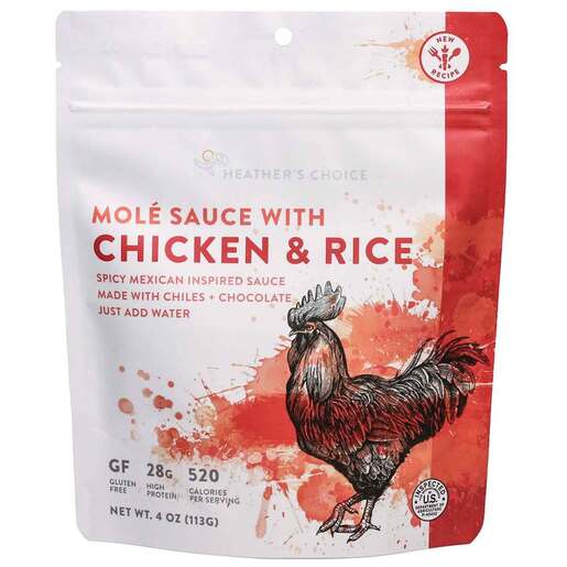 Heather's Choice Mole Sauce with Chicken and Rice Dinner Adventuring Meal - Molé is a sauce that was introduced to us by a dear friend who hails from Oaxaca, Mexico; and when we chat with her about molé her eyes light up with excitement! Molé is a Mexican sauce steeped in tradition and folklore. It can be found across the globe, and now it can be found in your backpack! Do you crave hearty backpacking food with a spicy kick? Then this meal is for you! Chicken Molé with Rice blends the exotic flavors of ancho and chipotle chilis, cocoa powder, cinnamon, clove, and more to deliver a meal that will excite your taste buds while supplying you with high-quality calories. Made with organic chicken, this paleo-friendly backpacking meal is high in protein and healthy fats. Our Chicken Molé will keep you going long after the sun has set behind the mountains! This dehydrated backpacking foods contain no artificial flavors, MSG, fillers, or preservatives. Enjoy an ultralight backcountry mealmade with all real ingredients, no surprises. Heather’s Choice backcountry meals and snacks provide an allergen-safe backpacking food option for individuals with a variety of dietary restrictions. Heather’s Choice Chicken Molé is gluten, soy, egg, peanut, and dairy-free. Our just add water meals are a convenient solution both on and off the trail! Heather's Choice products are ready for your next hiking, backpacking, backcountry hunting, fishing, or boating adventure. Our lightweight, packable meals are easy to stow on any outdoor recreational adventure and require just boiling water to prepare. Enjoy the same ready to eat convenience at home or in the office! Product Highlights Vegan and gluten-free No artificial flavors, MSG, fillers, or preservatives All real ingredients, no surprises Rich in healthy fat for long-lasting energy Free of gluten, soy, eggs, peanuts, and dairy Nutrition Facts Serving Size: 1 Bag (113g). Servings Per Container: 1. Amount Per Serving: Calories: 530, Calories From Fat: 190, Total Fat 21g (32% DV), Saturated Fat: 3g (15% DV), Trans Fat 0g, Cholesterol: 95mg (32% DV), Sodium: 360mg (15% DV), Total Carb: 52g (17% DV), Dietary Fiber: 7g (28% DV), Sugars: 15g, Protein: 38g (76% DV), Vit A (10% DV), Vit C (25% DV), Calcium (15% DV), Iron (25% DV). *Percent Daily Values are based on a 2,000 calorie diet. Ingredients Vegetable Stock (Water. Carrots. Onion. Celery. Olive Oil. Tomato Paste. Sea Salt. Black Pepper. Garlic. Parsley. Bay Leaves). Diced Tomatoes (Tomatoes. Tomato Juice. Salt. Calcium Chloride. Citric Acid). Chicken. Enriched Precooked Rice [Rice. Niacin. Iron (Ferric Orthophosphate). Thiamin (Thiamin Mononitrate). Folic Acid]. Onion. Almond Butter. Raisins. Ancho Chili Powder. Olive Oil. Cocoa Powder. Garlic. Sugar. Sesame Seeds. Chipotle Chili Powder. Cinnamon. Dried Cilantro. Clove. Contains: Almonds This product has a one-year shelf life.