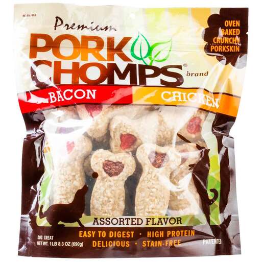 Pork Chomps 4in Assorted Crunchy Bonez - Pork Chomps are a 100% rawhide-free pork skin dog chew made with a patented and proprietary process. Removing 70% of the pork's fat creates a cleaner and healthier dog chew. Pork Chomps are baked, not fried, which results in a low-fat dog chew. Pork skin has a natural flavor that is appealing to dogs and preferred 9 to 1 over rawhide dog chews. Not to mention, they keep dogs busy, lasting multiple chewing sessions.