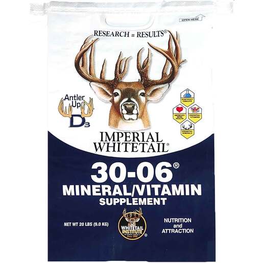 Whitetail Institute Imperial Whitetail 30-06 Mineral/Vitamin Supplement Attractant - 20lbs. 30-06 Mineral/Vitamin Supplement delivers essential macro and trace minerals along with vitamins A, D and E needed for a healthy herd and for bucks to reach more of their genetic potential in antler growth. 30-06 Mineral/Vitamin Supplement is a true, professionally formulated, high quality mineral and vitamin supplement – not a glorified salt lick. Whitetail Institutes' exclusive scent and flavor enhancer draws deer to 30-06 Mineral/Vitamin Supplement quickly and consistently. Professionally formulated specifically for the needs of deer during the spring and summer Includes necessary vitamins, and specific minerals in correct forms and ratios for antler growth, pregnancy and lactation Antler Up D3 increases calcium and phosphorus uptake to promote growth and development of antlers. Promotes heavier body weights and improves the overall health of deer Contains scent and flavor attractants and enhancers Easy to use – just rake or shovel an area 2 to 3 feet in diameter and mix with the soil Deer mineral mix is designed for use in ground sites