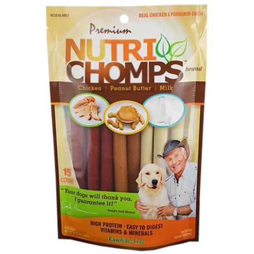 Nutri Chomps Assorted Flavor 6in Mini Twists - 15 Count - Nutri Chomps are a rawhide-free dog chew. Nutri Chomps are high in fiber & protein and low in carbs. Nutri Chomps first ingredients are chicken and pork skin making them fully digestible. Nutri Chomps are a safe & healthy rawhide alternative. These mini twists come in an assorted flavor package: Milk, Chicken, and Peanut Butter. The 6" twisting shape makes it a perfect chew for tiny, small and medium dogs. Easy To Digest Rawhide-Free High Protein