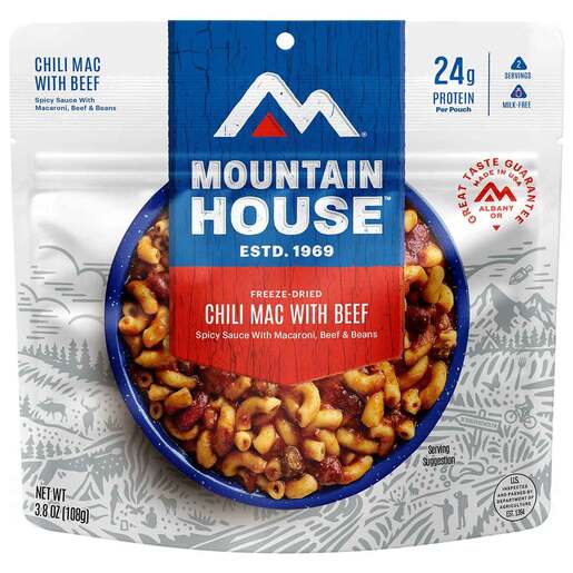 Mountain House Chili Mac with Beef - 2 Servings - Whether you're trekking the Sierra Nevada or camping with the Boy Scouts right in your backyard, Mountain House Chili Mac is an insanely delicious meal that's guaranteed to fill you right up at the end of a long day. Made with pillowy macaroni noodles, savory precooked beef and yummy kidney beans in a tasty chili sauce, our freeze dried Chili Mac is a customer favorite from coast to coast. Just add hot water and you'll have a comforting hot meal in minutes.