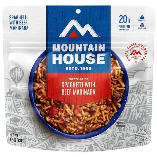 Mountain House Classic Spaghetti & Meat Sauce - 2 Servings - Now you can enjoy this classic dish wherever you are. Made with spaghetti pasta and real beef in a rich marinara sauce. This compact, lightweight pouch will go where you go. Tender Spaghetti pasta with chunks of beef in a rich marinara sauce. Made with no preservatives, artificial flavors or colors and gluten-free certified by GFCO. Pouch contains 2 total servings. Great for one hungry backpacker, or share with your camping buddy. Deliciously tasty food perfect for camping and backpacking trips! Eat well on top of the trail or in your tent. Recycle used packaging with TerraCycle to reduce waste.