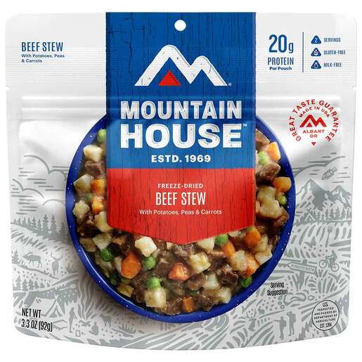 Mountain House Beef Stew - 2 Servings - Beef Stew is a camping and backpacking classic. Made with all natural beef, potatoes, and carrots. Hearty and delicious! Simply add hot water to the pouch and in about 8-10 minutes you'll have a delicious meal you can eat anywhere! Made with tender dices of all natural beef, potatoes, peas, and carrots. Made with no preservatives, artificial flavors or colors and gluten-free certified by GFCO. Pouch contains 2 total servings. Great for one hungry backpacker, or share with your camping buddy. Quick prep! Just add hot water to the pouch & eat in less than 10 minutes, with no cleanup! Deliciously tasty food perfect for camping and backpacking trips! Eat well on top of the trail or in your tent. Recycle used packaging with TerraCycle to reduce waste.