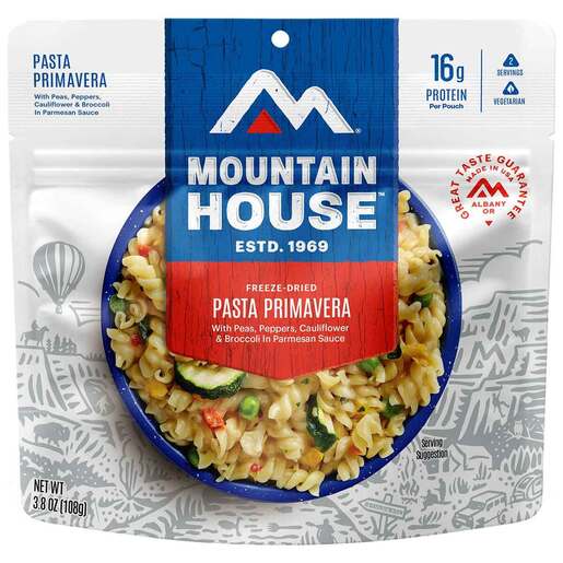 Mountain House Pasta Primavera - 2 Servings - Not only does Pasta Primavera look delicious, it tastes fantastic too! But then again, it's hard to go wrong when you use real zucchini, cauliflower, broccoli, red and yellow peppers with spiral macaroni in a creamy parmesan cheese sauce. An excellent vegetarian dish. Zucchini, spiral macaroni, cauliflower, broccoli, red & yellow peppers and green beans in a creamy, parmesan cheese sauce. Made with no preservatives, artificial flavors or colors and gluten-free certified by GFCO. Pouch contains 2 total servings. Great for one hungry backpacker, or share with your camping buddy. Quick prep! Just add hot water to the pouch & eat in less than 10 minutes, with no cleanup! Deliciously tasty food perfect for camping and backpacking trips! Eat well on top of the trail or in your tent. Recycle used packaging with TerraCycle to reduce waste.