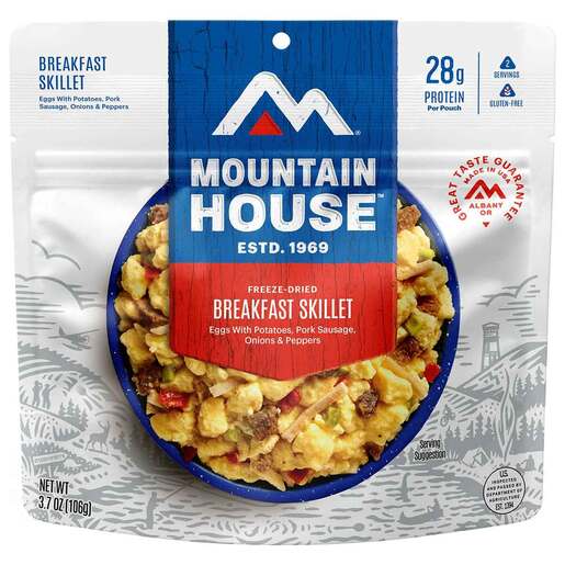 Mountain House Breakfast Skillet - 2 Servings - Hash browns, scrambled eggs mixed with pork sausage, peppers and onions for breakfast while backpacking? Yes please! One of Mountian House most popular breakfast items to bring along on the trail, or to put in the pantry for a rainy day. Either way Breakfast Skillet is a delicious meal to start your morning off right. Hash browns, scrambled eggs, crumbled pork patty, peppers and onions for breakfast! Made with no preservatives, artificial flavors or colors and gluten-free certified by GFCO. Pouch contains 2 total servings. Great for one hungry backpacker, or share with your camping buddy. Quick prep! Just add hot water to the pouch & eat in less than 10 minutes, with no cleanup! Deliciously tasty food perfect for camping and backpacking trips! Eat well on top of the trail or in your tent. Recycle used packaging with TerraCycle to reduce waste.
