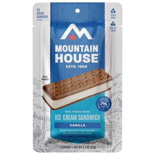 Mountain House Vanilla Ice Cream Sandwich - 1 Serving- A layer of delicious vanilla ice cream sandwiched between two chocolate cookie wafers. A perfect sweet treat with no refrigeration required! This no drip fix is the perfect solution for ice cream on the go. Take it with you backpacking, fishing, or on your next camping trip. Delicious vanilla ice cream in a chocolate cookie sandwich. Pouch contains 1 Ice Cream Sandwich. Great for one hungry backpacker, or share with your camping buddy. No mess and ready to eat right out of the bag. Deliciously tasty food perfect for camping and backpacking trips! Eat well on top of the trail or in your tent. Recycle used packaging with TerraCycle to reduce waste.