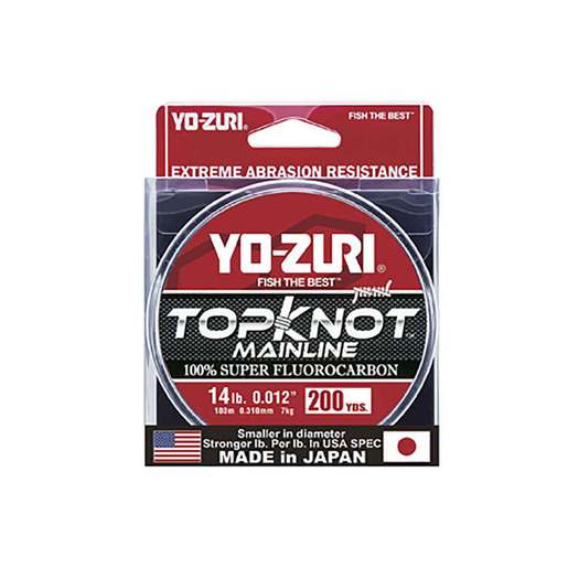 Yo-Zuri TopKnot Mainline Fluorocarbon Fishing Line - 200yds The Yo-Zuri TopKnot MainLine—Natural Clear—is Abrasion Resistant and Super Durable which maintains its clarity even after extended use and allows the angler to get even more strikes on the same line. The most pressing feature, however, is the diameter to strength ratio. The TopKnot series offers the strongest possible breaking strength with an even smaller diameter than before. This is a must have product for any angler! Thin Diameter Superior Knot Strength Low Memory Abrasion Resistant
