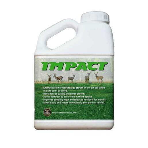 Whitetail Institute Impact Forage Attractant - Water soluble soil amendment that easily mixes and sprays. UTV, tractor or hand held sprayers. Depending on soil type and rainfall amounts, Impact can improve forage quality and growth for 3-5 months with one application. Great for annual plantings. Perennial plots could need two or three applications. Covers 1/4 acre.