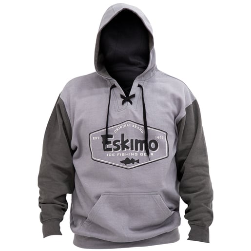 Eskimo Hockey Men's Ice Fishing Hoodie - A classic hockey-style hoodie design with modern styling. The 13 oz heavyweight construction is great for cold winter days. Heavyweight cotton blend Two toned hockey hoodie Lined Hood Drawcord adjustment