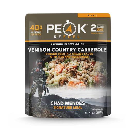 Peak Refuel Venison Country Casserole - 2 Servings - A meal that embodied the taste of a home-cooked meal while still providing the best fuel out there. With the perfect amount of rice, the creamiest sauce, and delicious veggies, you'll feel like you're sitting at a dinner table even in the deepest part of the backcountry. This will definitely leave you wanting more - I'm pumped for you to try it! Features Protein – 40g per pouch Servings - 2 Serving size – ½ pouch Contains – Milk, Wheat Net Weight – 6.20oz Made & Packaged in the USA Calories per Pouch - 920 Prep Time - 10 min Water - 8oz