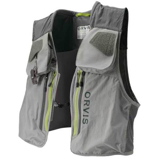 Orvis Men's Ultralight Fishing Vest - Keep everything you need close at hand in our well-appointed Ultralight Fishing Vest. The Ultralight Fishing Vest offers a new modern, sleek, and functional design that integrates perfectly with the concept of the Ultralight Wading System. The low-profile design keeps load closer to the body and the slimmer design reduces the "layered bulk" of conventional vests. Lightweight material, treated with DWR, dries faster and breathes better. Strategically integrated mesh offers ventilation and form-fitting comfort. Eleven pockets, 6 exterior, 4 interior, and 1 rear. Four large vertical chest pockets for fly boxes, two of which have internal stretch mesh organization pockets. Two exterior vertical chest pockets higher on the shoulder hold leaders, tippet and other accessories. Two interior vertical chest pockets hold valuables and the right pocket has a key clip. Lower interior stretch mesh pockets form to load for maximum comfort. Highly adjustable sliding clip closure allows you to adjust vertically to the most comfortable position. Two multi-function hook-and-loop fly patches hide a port for zinger. Construction design allows nippers to nest under patch for quick but out of the way access. Forceps can be slid up from the outside underneath patch for easy access. Two elastic cords on exterior of chest pockets for adding accessories and tippet bar. Soft poly/spandex blend lined foam collar for maximum comfort around the neck. Internal webbing loop for hanging the vest. Style: 2MXB0951