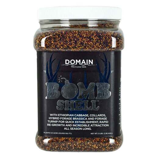 Domain Bombshell Food Plot Mix - 3lbs - A unique mix of "Super Foods" designed to grow rapidly, mature quickly and handle the toughest of conditions; including heat, drought and sever cold. By combining Ethiopian cabbahe, forage collards, hybrid forage brassica and forage turnip you'll get maximum forage production, great re-growth potential, impressive nutritional value and unbeatable attractiveness, with maturity in just 40-60 days. This premium mixture of brassicas provides elevated levels of warm season deer forages, high in protein and can remain green well into winter regardless of location.