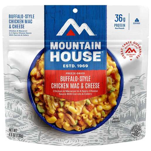 Mountain House Buffalo Style Chicken Mac and Cheese Pouch - Here's comfort food to the next level. This meal combines Mountain House's signature creamy Mac & Cheese with chicken and a spicy buffalo sauce and it doesn't hold back. Enjoy while camping, tailgating, or at home.