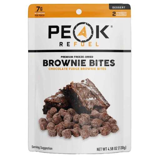 Peak Refuel Chocolate Fudge Brownie Bites - It's time to up your dessert game in the backcountry. Have you ever been able to pack a brownie on a hike? Now you can! With two servings and a resealable pouch, there's no need to worry about your dessert melting or getting crushed - just pop a few in your mouth and feed your sweet tooth with the best trail dessert on the market. Protein – 7g per pouch Servings - 2 Serving size – ½ pouch Contains – Milk, Wheat, Soy Net Weight – 4.58oz Made & Packaged in the USA Calories per Pouch - 610 Prep Time - Rip and Pop