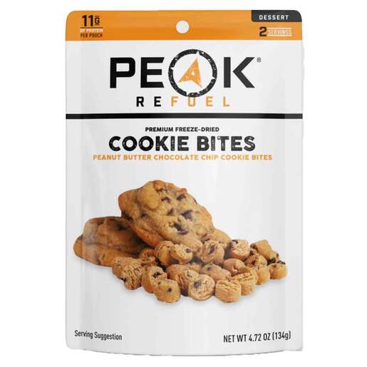 Peak Refuel Peanut Butter Chocolate Chip Cookie Bites - You read that right - peanut butter cookies, but backcountry style. This is the perfect dessert to snack on after a long day of hiking, mountain biking, or camping. Going on a hunting trip? Even better - take these cookie bites! Wherever you're headed, you're going to want these in your pack. Protein – 11g per pouch Servings – 2 Serving size – ½ pouch Contains – Milk, Wheat, Soy, Peanut Net Weight – 4.72oz Made & Packaged in the USA Calories per Pouch – 640 Prep Time - Rip and Pop