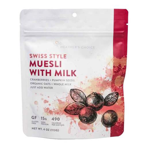 Heather's Choice Swiss Muesli with Milk - Ready to be transported to the Swiss Alps? This Swiss Muesli is about as authentic as can be. Heather's Choice added whole milk, butter powder, and cardamom for a breakfast that's downright decadent. It's become a favorite here at Heather's Choice headquarters on cold mornings in Alaska. Features Gluten-free No artificial flavors, MSG, fillers, or preservatives All real ingredients, no surprises Rich in healthy fat for long-lasting energy This product has a one year shelf life from the produced on date. Nutrition Facts Serving Size: 1 Bag (113g). Servings Per Container: 1. Amount Per Serving: Calories: 490, Total Fat 20g (29% DV), Saturated Fat: 4g (20% DV), Trans Fat: 0g, Cholesterol: 10mg (3% DV), Sodium: 880mg (38% DV), Total Carbohydrates: 64g (23% DV), Dietary Fiber: 7g (25% DV), Sugars: 25g, Incl. 14g Added Sugars (28%), Protein: 15g (30%), Vit D (0% DV), Iron 4.2mg (25% DV), Calcium 180mg (25% DV), Potassium 240mg (4% DV). *Percent Daily Values are based on a 2,000 calorie diet. Ingredients Gluten-Free Rolled Oats*. Powdered Whole Milk. Dried Cranberries (Cranberries. Sugar. Sunflower Oil). Pumpkin Seeds. Almonds. Butter Powder (Sweet Cream. Salt. Annato Color. Non Fat Milk Solids). Raw Sugar*. Sea Salt. Cardamom. *Certified Organic Ingredients Contains: Dairy & Tree Nuts