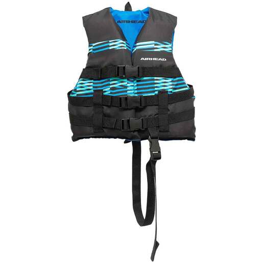 Airhead Element Life Jacket - The open-sided Life Jacket in Element provides top-tier safety with streamlined flexibility. Children, youth, and adults can rest easy in this life jacket equipped with premium safety features that deliver for years to come. This life preserver is U.S. Coast Guard and Transport Canada approved, so you can rest assured your family is in good hands when wearing these jackets. It also has three secure body belts that connect three release buckles for easy removal. An extra strap adds even more safety to the children's life jacket. The open-sided design flexes to meet different body shapes and ensure proper fit. Plus, the Element life jacket offers more breathability on days when the sun is shining bright. This life jacket comes in a stunning black and blue design, perfect for sunny days on the water. Level 70: U.S. Coast Guard & Transport Canada approved. Less bulky design for when quick rescue is likely. Offers larger range of motion Open-Sided: Open sides allow for better ventilation to keep you cooler throughout the day Buckles: Side release buckles open and close quickly to ensure safety and security on the water