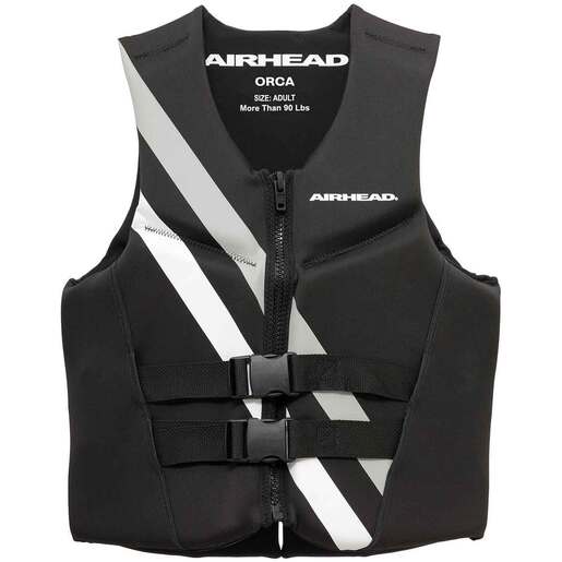 Airhead Orca Neolite Kwik-Dry Life Jacket - Why wear an ordinary life jacket when you can wear the Orca Neolite life jacket? This luxurious life jacket is great for all types of water adventures, including boating, PWC’s, and watersports. Made from Kwik-Dry material, it’s soft and smooth to the touch. The Neolite fabric ensures that this jacket wicks away moisture and feels airy and light while you wear it. The zippered closure in the front offers a traditional vest design, and two hidden 1.5in straps improve safety and security. Quick-release buckles made this life jacket easy to remove in an instant. Families also love this life preserver because it’s U.S. Coast Guard approved. Orca comes in a sleek black color with modern stripes that goes well with everything. It’s available in nine different sizes. Type III: U.S. Coast Guard approved. Less bulky design for use when quick rescue is likely. Offers larger range of motion Closed-Sided: Offers a tighter and more secure fit to keep your life jacket in place Zippers: Easily and quickly fasten and remove your vest to stay safe in the water Neolite Kwik-Dry: Quick-drying and super soft. This fabric keeps you comfortable and dry all day long