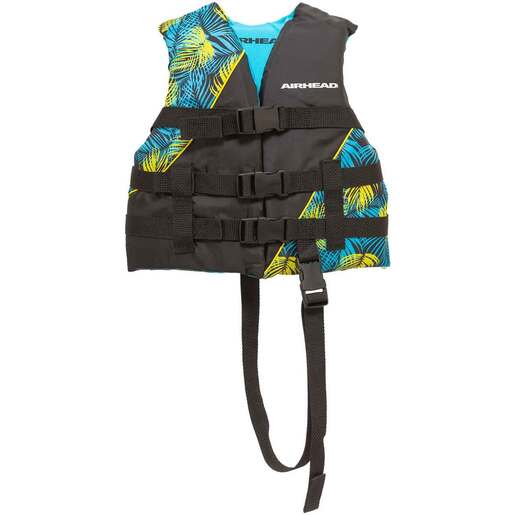 Airhead Tropic Life Jacket - Gear up for a day of adventure in this stunning life jacket for children and adults. The closed-sided Tropic Life Jacket comes in an innovative new design that streamlines safety and comfort. It’s made from a soft woven 200D polyester shell, which provides a superior experience for staying afloat in the water (and wicking water away on board). The closed-sided vest design adds more comfort than a traditional life jacket, and four straps make the wearer feel secure. On the children’s life jacket, an extra strap adds safety. This life preserver comes in a stunning tropical design, perfect for sunny days on the water. Plus, it meets U.S. Coast Guard and Transport Canada requirements—you can rest assured your family is in good hands when wearing these jackets. Level 70: U.S. Coast Guard & Transport Canada approved. Less bulky design for when quick rescue is likely. Offers larger range of motion. Adult 4XL/6XL is Type III: U.S. Coast Guard approved only Closed-Sided: Offers a tighter and more secure fit to keep your life jacket in place Buckles: Side release buckles open and close quickly to ensure safety and security on the water