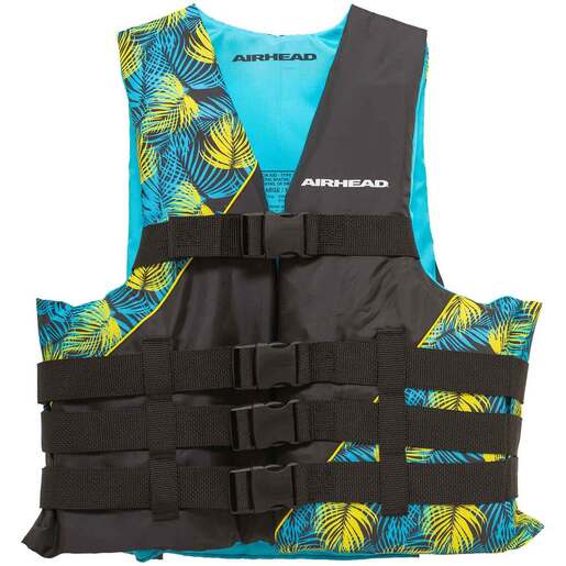 Airhead Tropic Life Jacket - Gear up for a day of adventure in this stunning life jacket for children and adults. The closed-sided Tropic Life Jacket comes in an innovative new design that streamlines safety and comfort. It’s made from a soft woven 200D polyester shell, which provides a superior experience for staying afloat in the water (and wicking water away on board). The closed-sided vest design adds more comfort than a traditional life jacket, and four straps make the wearer feel secure. On the children’s life jacket, an extra strap adds safety. This life preserver comes in a stunning tropical design, perfect for sunny days on the water. Plus, it meets U.S. Coast Guard and Transport Canada requirements—you can rest assured your family is in good hands when wearing these jackets. Level 70: U.S. Coast Guard & Transport Canada approved. Less bulky design for when quick rescue is likely. Offers larger range of motion. Adult 4XL/6XL is Type III: U.S. Coast Guard approved only Closed-Sided: Offers a tighter and more secure fit to keep your life jacket in place Buckles: Side release buckles open and close quickly to ensure safety and security on the water