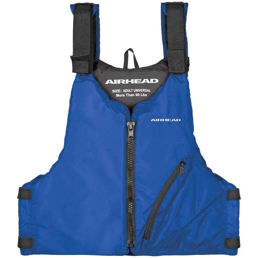Airhead Base Paddle Vest Life Jacket - Well-suited for every type of paddle sport, this Base Paddle Vest Series boosts ventilation and ease of motion as you navigate through the water. This youth and adult life jacket features a large front zipper pocket, which is perfect for safety accessories or snacks, and the high-quality zipper helps you get in and out in a flash. The streamlined design features breathable mesh across the lower back, which keeps you cool, plus neoprene shoulder pads for optimum comfort. Thanks to compact foam distribution and a thin foam insert in the back, this life jacket doesn’t limit your range of motion when paddling. On the outside, a durable UV-resistant 200 denier nylon cover resists the damage inflicted by saltwater, sun, and age, so your jacket will always look fresh. Also, a convenient hanging loop makes it easy to hang up and dry at the end of the day. Level 70: U.S. Coast Guard & Transport Canada approved. Less bulky design for when quick rescue is likely. Offers larger range of motion Open-Sided: Open sides allow for better ventilation to keep you cooler throughout the day Buckles: Side release buckles open and close quickly to ensure safety and security on the water Zippers: Easily and quickly fasten and remove your vest to stay safe in the water