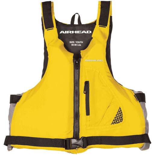 Airhead Base Paddle Vest Life Jacket - Youth - Well-suited for every type of paddle sport, this Base Paddle Vest Series boosts ventilation and ease of motion as you navigate through the water. This youth and adult life jacket features a large front zipper pocket, which is perfect for safety accessories or snacks, and the high-quality zipper helps you get in and out in a flash. The streamlined design features breathable mesh across the lower back, which keeps you cool, plus neoprene shoulder pads for optimum comfort. Thanks to compact foam distribution and a thin foam insert in the back, this life jacket doesn’t limit your range of motion when paddling. On the outside, a durable UV-resistant 200 denier nylon cover resists the damage inflicted by saltwater, sun, and age, so your jacket will always look fresh. Also, a convenient hanging loop makes it easy to hang up and dry at the end of the day. Level 70: U.S. Coast Guard & Transport Canada approved. Less bulky design for when quick rescue is likely. Offers larger range of motion Open-Sided: Open sides allow for better ventilation to keep you cooler throughout the day Buckles: Side release buckles open and close quickly to ensure safety and security on the water Zippers: Easily and quickly fasten and remove your vest to stay safe in the water