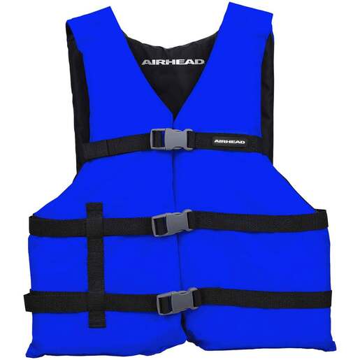 Airhead General Boating Life Jacket - Adult 4 Pack - Airhead's General Boating Life Jacket is a reliable wearable flotation device that families and kids can count on. It offers a range of sizes, including child, youth, adult universal, and adult oversized, all of which are U.S. Coast Guard and Transport Canada approved. Crafted with a 200 denier polyester shell, this adult type 3 life jacket is nothing short of durable. It also features a lightweight Poly-E flotation device inside the jacket. Both of these materials work together to provide optimum flotation power. This jacket has an open-sided design that adapts to a wide range of bodies, but it boasts three straps that clip on the side to make the wearer feel secure.