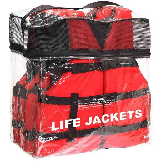 Airhead General Boating Life Jacket - Adult 4 Pack - Airhead's General Boating Life Jacket is a reliable wearable flotation device that families and kids can count on. It offers a range of sizes, including child, youth, adult universal, and adult oversized, all of which are U.S. Coast Guard and Transport Canada approved. Crafted with a 200 denier polyester shell, this adult type 3 life jacket is nothing short of durable. It also features a lightweight Poly-E flotation device inside the jacket. Both of these materials work together to provide optimum flotation power. This jacket has an open-sided design that adapts to a wide range of bodies, but it boasts three straps that clip on the side to make the wearer feel secure.