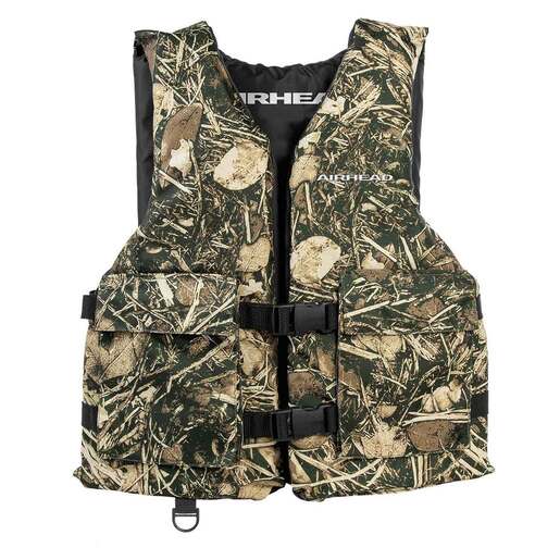 Airhead Sportsman Camo Life Jacket - Searching for something that’ll suit an avid outdoors person? The Sportsman Life Jacket is perfect for anyone who loves fishing or paddling at epic proportions. U.S. Coast Guard and Transport Canada approved - and crafted from durable polyester fabric - this life jacket is guaranteed to keep you safe for years to come. A pair of midsection belts and quick-release buckles help you customize the fit and unhook it with ease. The open sides help you stay nimble when enjoying all your favorite watersports while allowing extra breathing room on hot days. You will also find two large pockets on the front for stashing away your essentials; plus, the handy D-ring makes it easy to attach extra accessories. Level 70: U.S. Coast Guard & Transport Canada approved. Less bulky design for when quick rescue is likely. Offers larger range of motion Open-Sided: Open sides allow for better ventilation to keep you cooler throughout the day Buckles: Side release buckles open and close quickly to ensure safety and security on the water