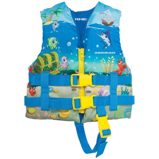 Airhead Treasure Life Jacket - Your tiny tots will look adorable in this treasure-chest themed life jacket featuring sharks, fish, octopus, and other friendly ocean creatures! This design is sure to get your child excited about getting in the water (and staying safe while doing it). The infant and child sizes offer additional straps and buckles for maximum security and growth accommodation. Both sizes are also designed with a front zipper for ease and convenience when putting on and removing these preservers. In addition, the infant life preserver features an added headrest to ensure your little one's head stays above water. Finally, the child size features a second waist buckle to ensure your little one stays safe and doesn't outgrow their jacket too quickly. Airhead's child size is also U.S. Coast Guard and Transport Canada approved. So get ready for boating, fishing, unforgettable adventures, and more! Level 70: U.S. Coast Guard & Transport Canada approved. Less bulky design for when quick rescue is likely. Offers larger range of motion. Infant is Type II: U.S. Coast Guard approved only. Closed-Sided: Offers a tighter and more secure fit to keep your life jacket in place Buckles: Side release buckles open and close quickly to ensure safety and security on the water Zippers: Easily and quickly fasten and remove your vest to stay safe in the water