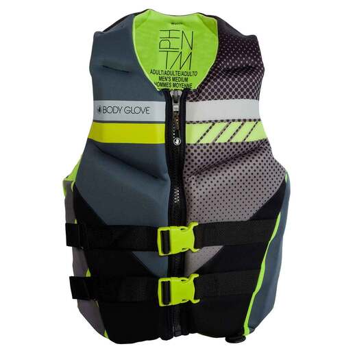 Body Glove Phantom Men's PFD Life Jacket - Durable Yamamoto neoprene outer shell Ultra-light interior lining Beveled soft PVC (front) foam flotation for maximum comfort Advanced air-foam technology Segmented neoprene panels for increased flexibility Lumbar protection pad Front-zip entry Strategically placed drain panels 2 heavy-duty 1.5in belts with durable quick-release buckles Concealed backside buckle straps