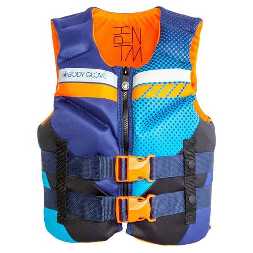 Body Glove Phantom Youth PFD Life Jacket - Light-weight breathable Evoprene outer shell Ultra light interior liningLight-weight form fitting PE foam Segmented panels for increased flexibility Front zip entry Strategically placed drain panels 2 Heavy-duty 1.5in belts with durable quick release buckles Concealed backside buckle straps