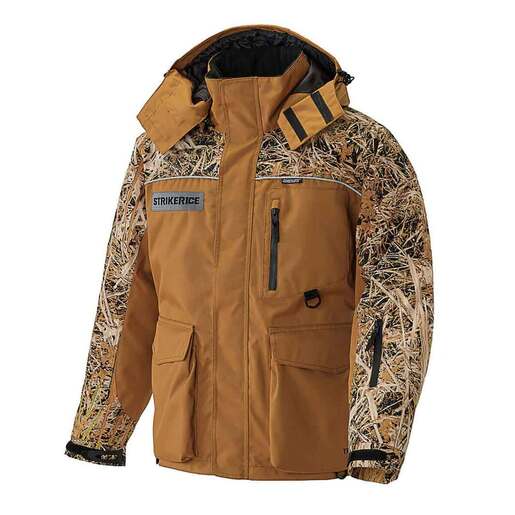 Striker Ice Brown/Camo Trekker Men's Ice Fishing Jacket - The Trekker is the best option for early and late ice, as well as cold and windy tournament days on the boat. The Trekker Jacket features the same amount of Sureflote as our most advanced jackets and the same rugged 600D Endura shell as our Hardwater. Stylish and versatile, it is a great option for early and late ice environments, and perfect for ice anglers in slightly warmer climates. The Trekker jacket keeps you safe and warm without breaking the bank. Features: 600D Endura Outer Shell Hydrapore Waterproof 5,000mm / Breathable 5,000g 150g Sureflote Flotation Assistance Technology 60g Thermadex Insulation Reflective Elements for Added Safety Removable Hood with Memory Wire Visor Fast-Drain Hem and Sleeve Cuff