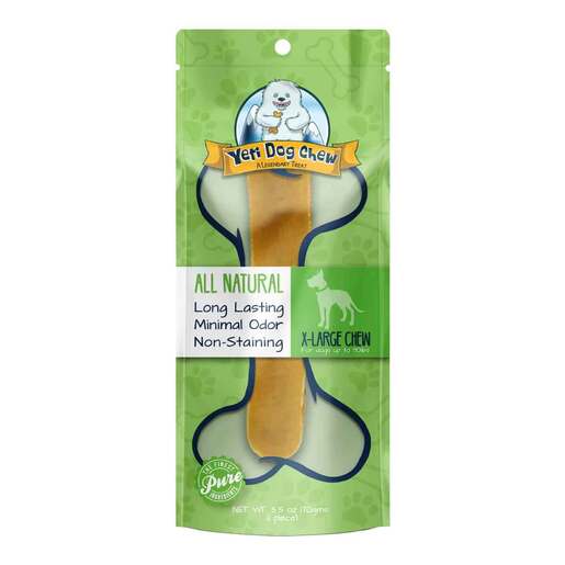 Yeti Dog Chew Extra Large Chew Treat - Yeti Dog Chew is an all natural and healthy dog chew made of hardened CowithYak milk cheese. These organic chews are not only good for dogs of all sizes and ages, the product doesn't stain, splinter, and has minimal odor. The hard and long-lasting chew is the perfect treat to keep your dog happy and occupied for a while in a safe and natural way. When a small piece is left over from the chew, it can pose a choking hazard for your dog. Simply take the remaining piece and heat it in the microwave for 45-60 seconds, and it should puff up to twice its size. Once it cools, feed it to your dog for a crunchy treat! The package comes with 1 piece of the x-large chew (5.5 oz) for dogs over 55lbs Ingredients: Yak Milk, Cow Milk, Lime Juice