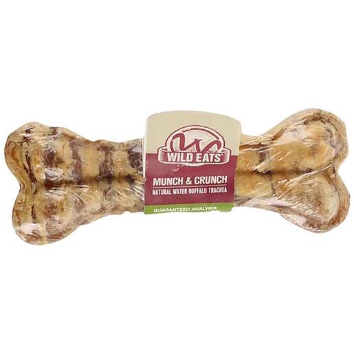 Wild Eats Large Munch and Crunch Dog Treat - Wild Eats Water Buffalo Munch & Crunch Bones are a natural, single source of protein perfect to satisfy a dog's natural cravings. Munch & Crunch Bones are made from the naturally compressed trachea, sourced from free-range & grass-fed Water Buffalo, which makes a highly satisfying and crunchy treat. The natural texture of the water buffalo trachea helps to clean teeth & gums as a pet chews, which aids in overall dental health. Munch & Crunch Bone is also gluten-free & grain free. Promotes healthy teeth & gums High in protein while low in fat No additives or preservatives Sustainably Sourced