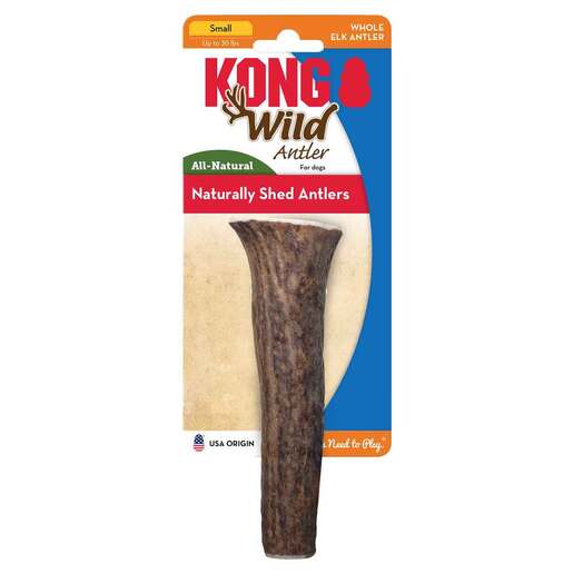 Kong Whole Wild Elk Antler - Small - Bring a little bit of the wild home for your dog. KONG Wild Antlers an the ideal, all-natural chewing solution. Ultra-durable elk antler chews provide extended enjoyment, satisfying even the most determined chewers. Naturally-shed KONG Antlers are odor-free, mineral-rich and they clean teeth and gums. All KONG Antler products are produced using the highest quality, grade-A elk antlers, ensuring a safe, long-lasting and delicious experience. 1% all-natural and sustainable Naturally shed wild elk antlers Satisfies natural chewing instinct Cleans teeth and freshens breath Available in sizes: XS, S, M and L