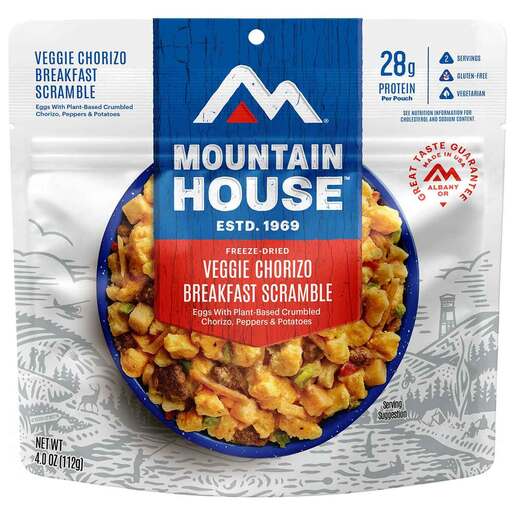 Mountain House Veggie Chorizo Breakfast Scramble - 2 Servings - Loaded with flavor and the perfect level of heat, enjoy an expert blend of eggs, potatoes, peppers, and onions with Mountain House's signature Veggie Chorizo. The perfect meatless way to kickstart your day. Move over oatmeal - the new breakfast is here! Features No Artificial Colors No Artificial Flavors Gluten-Free 30 Year Taste Guarantee