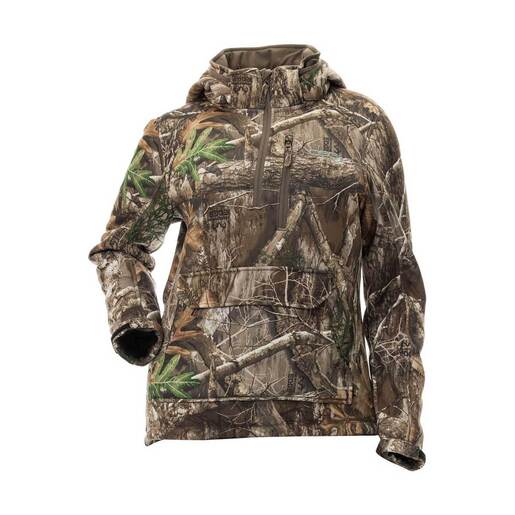 DSG Outerwear Women's Realtree Edge Breanna 2.0 Fleece Hunting Jacket - The ultimate combination of function and comfort, the Breanna fleece camo pullover is made of a quiet, bonded stretch fabric with a soft shearling interior. This fabric is DWR treated to help shed water to keep you warm and comfortable. The Realtree Edge camouflage is used so you can blend into your environment at close range, and from a distance. DWR treatment on face of the fabric to shed water Durable waterproof repellent Removable & adjustable hood Adjustable cuffs Two-way kangaroo pocket with hook & loop closure on top entrance Super soft interior Style: 99957