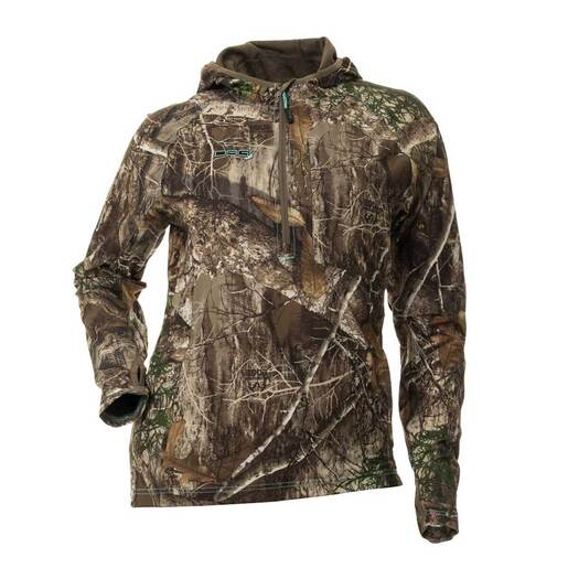 DSG Outerwear Women's Realtree Edge Bexley 3.0 Ripstop Tech Hunting Hoodie - DSG's latest version of Bexley, Bexley 3.0, is made of a lightweight and breathable Ripstop material that is water repellent in light rain. Bexley 3.0 is made specifically for warmer climates and is excellent at wicking moisture and keeping you as cool as possible in warm temperatures while still being completely covered. Ripstop fabric with water repellent exterior Moisture wicking, lightweight and breathable Attached hood with soft elastic binding Comfort length sleeves with built in thumb holes Concealed zipper pocket on upper chest and front pocket pouch Early Season Style: 51934
