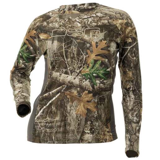 DSG Outerwear Women's Realtree Edge Ultra Lightweight Hunting Shirt - Ultra Lightweight Camo shirt that will help keep you cool on those warmer hunting days! This shirt keeps your skin protected from the sun with UPF 50+ protection, and the mesh panels on the sides allow air to flow through to keep your core ventilated. DSG's moisture wicking and quick dry material will also aid in keeping your body cool! UPF 50+ Protection Moisture Wicking Quick Dry Mesh side panels for ventilation Early Season Style: 51794