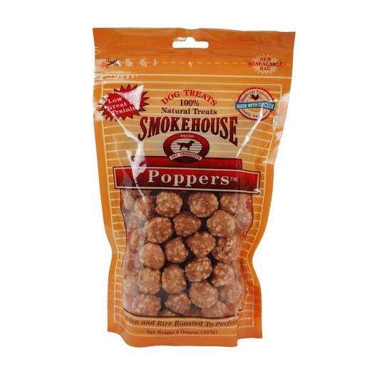 Smokehouse Chicken Poppers Dog Treats - These Poppers are a healthy and wholesome treat that is sure to get your dog's attention. Made naturally with only the finest chicken and rice. There are no additives, colorings, or preservatives and best of all they are low in fat. Making these a great reward or training treat! 227g Resealable bag 100% Natural Treats Made with rice and chicken