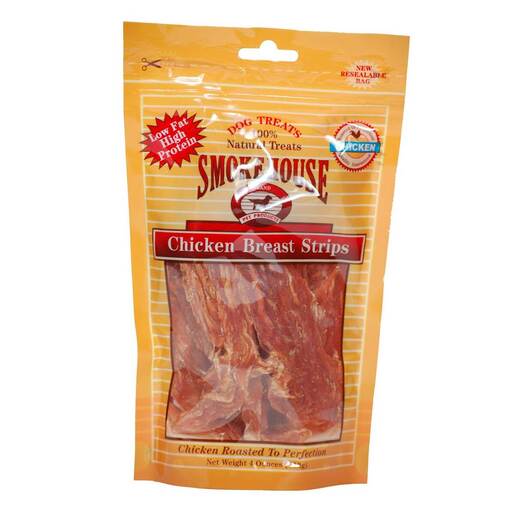 Smokehouse Chicken Breast Strips Dog Treats - Chicken Breast Strips are one of Smokehouse's most popular treats. They are 100% natural and made with love and care. No added colorings, preservatives, chemicals of any kind. They are full of flavor and your dog is sure to love them. Chicken Breast Strips are rich in flavor, low in fat and high in protein - what could be better! Have a smaller dog? Try the Chicken Breast tender Snacks. The same great treat just in a bite size piece. Try these for training too! 113g Low fat high protien 100% natural treats Resealable bag