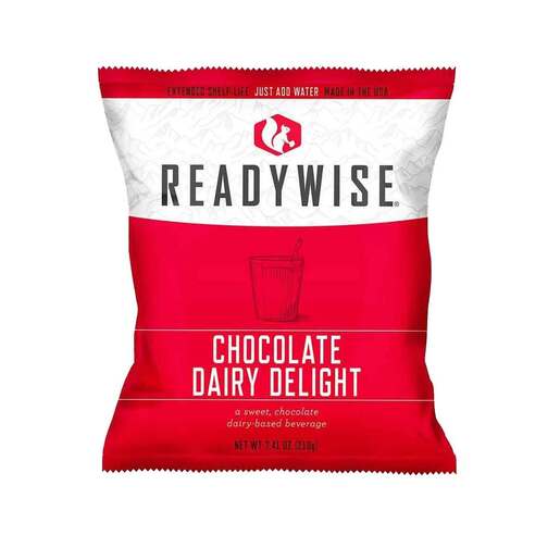 ReadyWise Chocolate Dairy Delight - 6 Servings - This bag offers 6 servings of a delicious, high calorie chocolate milk that provides comfort and another great option for any family. Remove oxygen absorber prior to preparation One Serving: Combine 3 tablespoons with 1 cup room temperature water and stir until dissolved. Chill if desired. Full Pouch: Combine contents of pouch with 6 cups room temperature water and stir until dissolved. Chill if desired. Drink is safely sealed in Metallyte pouches. To avoid waste, each pouch conveniently contains 6 servings. 20 Year Shelf Life.